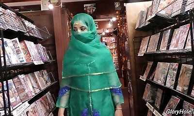 Hot Pakistani chick Nadia Ali sucks big dick in the glory hole guest room