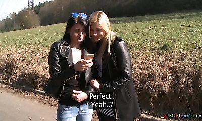 Two unbelievable looking German sluts sharing a hard rod outdoors